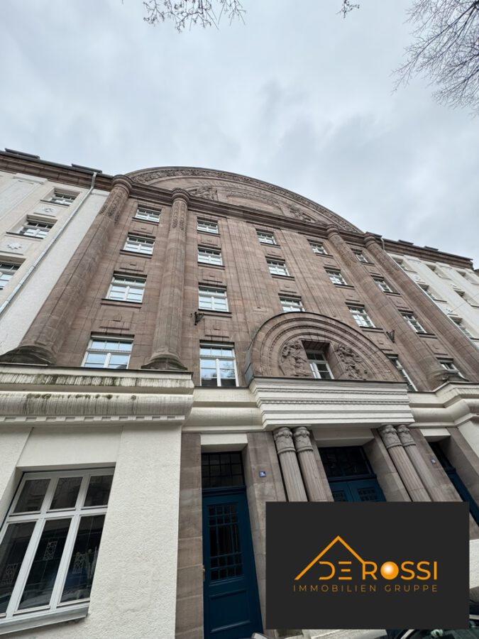 Monumentaler, fünfgeschossiger und traufständiger Satteldachbau, Putzbau mit Sandsteinmittelrisalit, Rundgiebel, kolossalen Sandsteinhalbsäulen und Rundbogenportal, reicher geometrischer und klassifizierender Jugendstildekor, bezeichnet „1912“